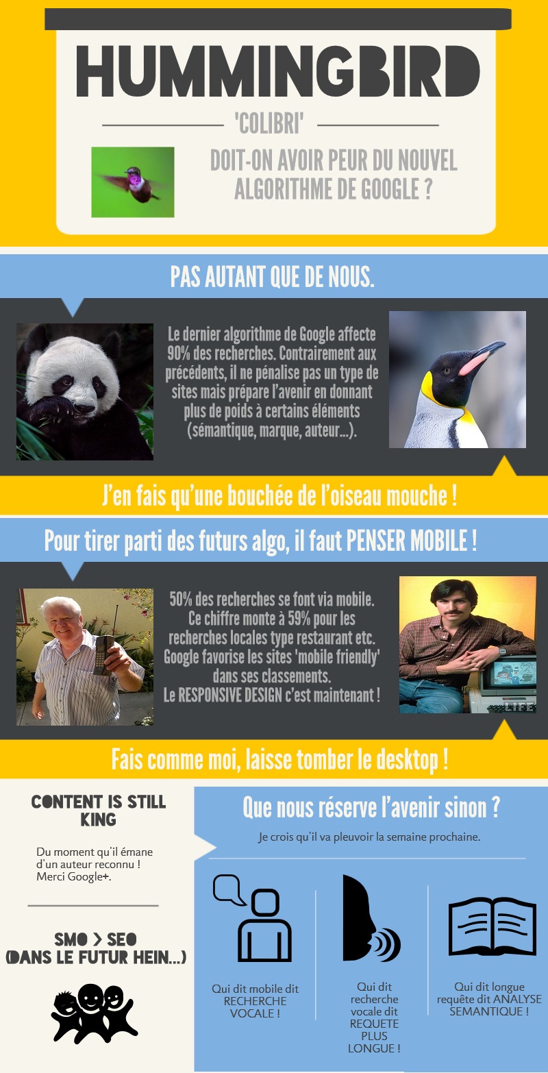En ce samedi reposant, je m’amusais avec mon logiciel de veille Ă faire une veille stratĂ©gique sur des infographies rigolotes, et j’ai trouvĂ© une illustration sur l’algorithme Hummingbird de Google. RĂ©cemment, on n’entend plus trop parler de lui (avec l’histoire du HTTPS qui a pris toute sa ampleur), et je me suis dit qu’il est bon de faire une petite piqĂ»re de rappel.